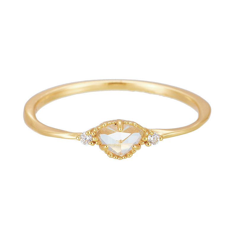 The Cordelia Ring is a delicate symbol of elegance and romance. Crafted from premium Sterling Silver and finished with a luxurious gold plating, this ring features a captivating heart-shaped white crystal flanked by two petite accent stones. Its refined geometric silhouette and shimmering details make it the perfect piece for women who appreciate subtle sophistication and timeless charm.