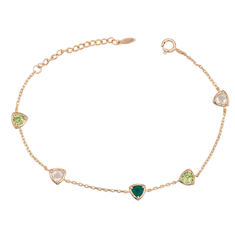 Radiate effortless elegance with the Despina Bracelet, a harmonious blend of color, light, and sophistication. Expertly crafted from gold-plated sterling silver, this exquisite piece features a sequence of geometric settings adorned with artificial and semi-precious stones, including delicate shades of olivine, prehnite, and chalcedony. Each gem catches the light with a soft, celestial glow, creating a bracelet that feels both modern and timeless.