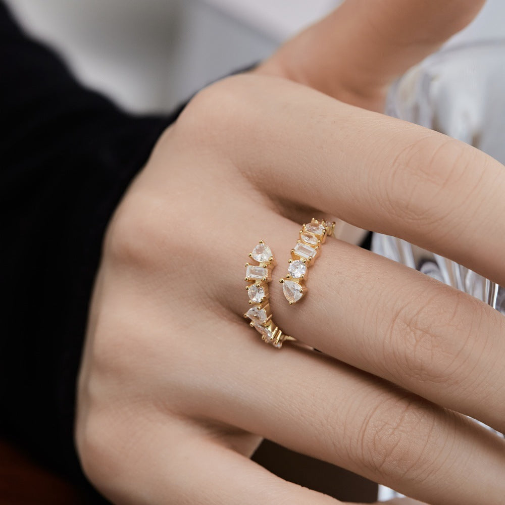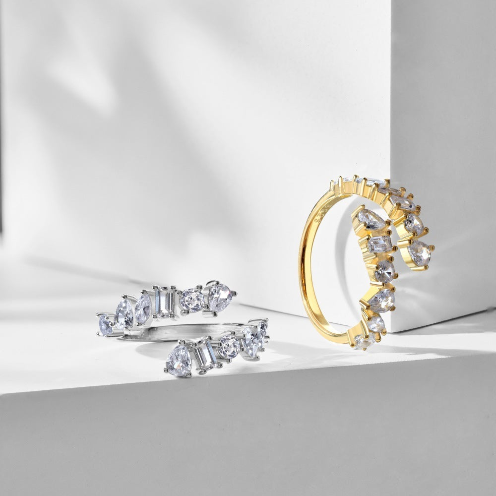Embrace celestial brilliance with the Gokada Ring. Expertly crafted from high-quality Sterling Silver, this open adjustable ring dazzles with a constellation of Moissanite stones in various geometric cuts. Each stone captures and reflects light beautifully, creating a multi-dimensional sparkle that embodies elegance and modern artistry. Designed for the contemporary woman, the Gokada Ring combines timeless charm with an effortlessly chic silhouette, perfect for both daily wear and special occasions.