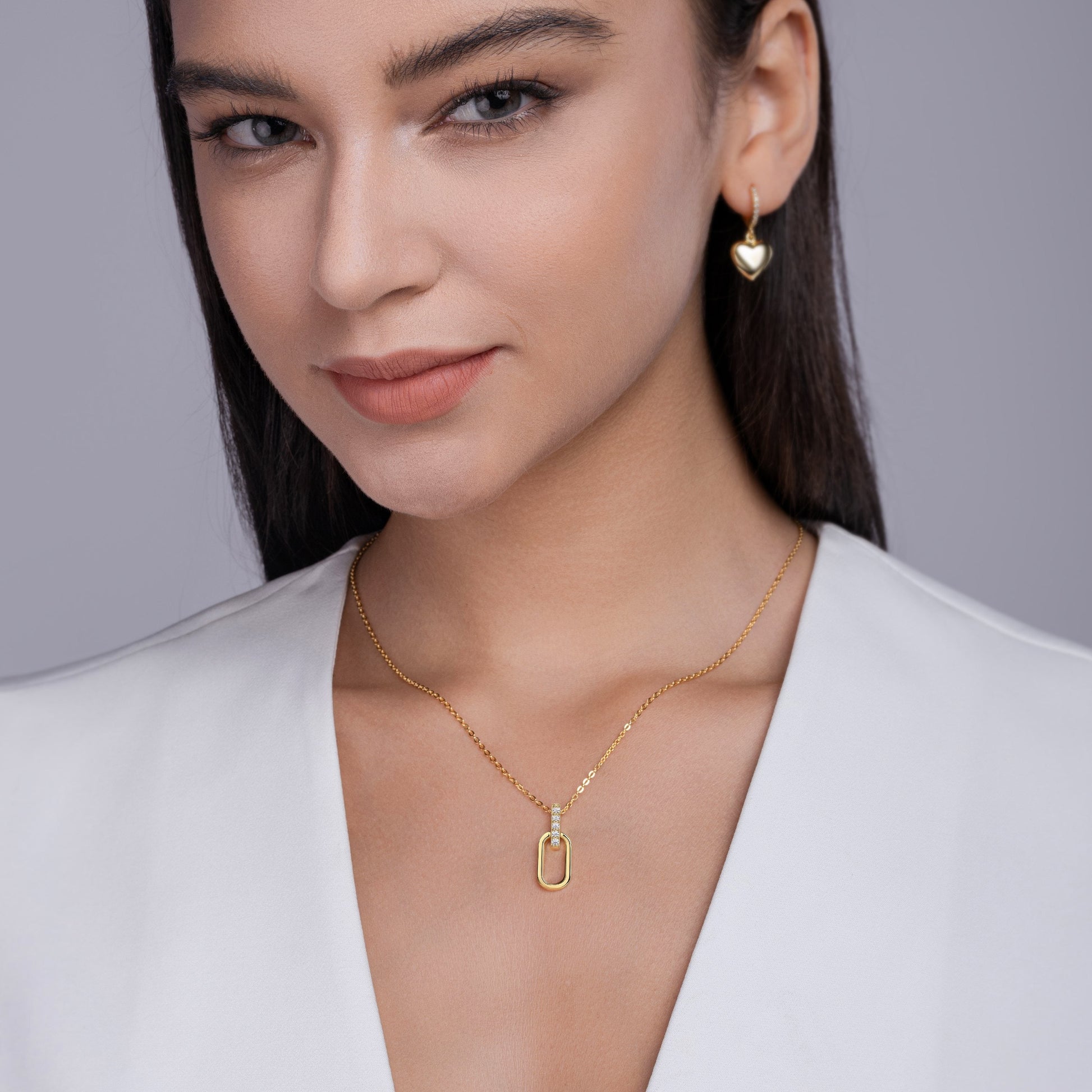 Radiate refined elegance with the Niloufer Necklace, a symbol of modern sophistication and timeless allure. Crafted from high-quality Sterling Silver and accented with a captivating Moissanite center stone, this necklace embodies the perfect balance of minimalism and brilliance. Its sleek geometric pendant, plated in gold and adorned with precision-cut stones, reflects a graceful glow that enhances any outfit—from everyday wear to special occasions.