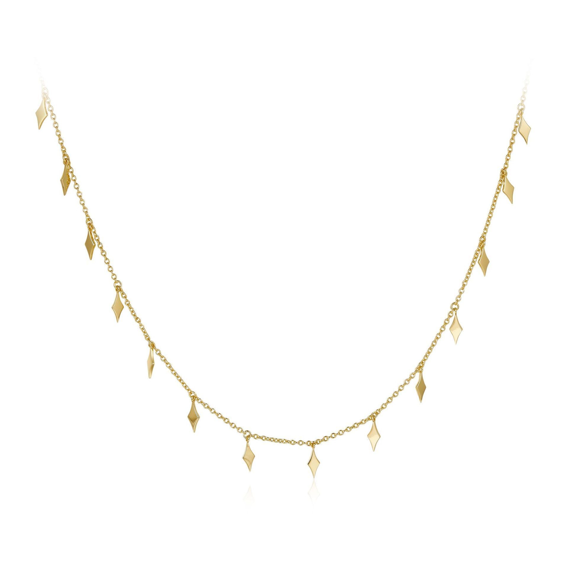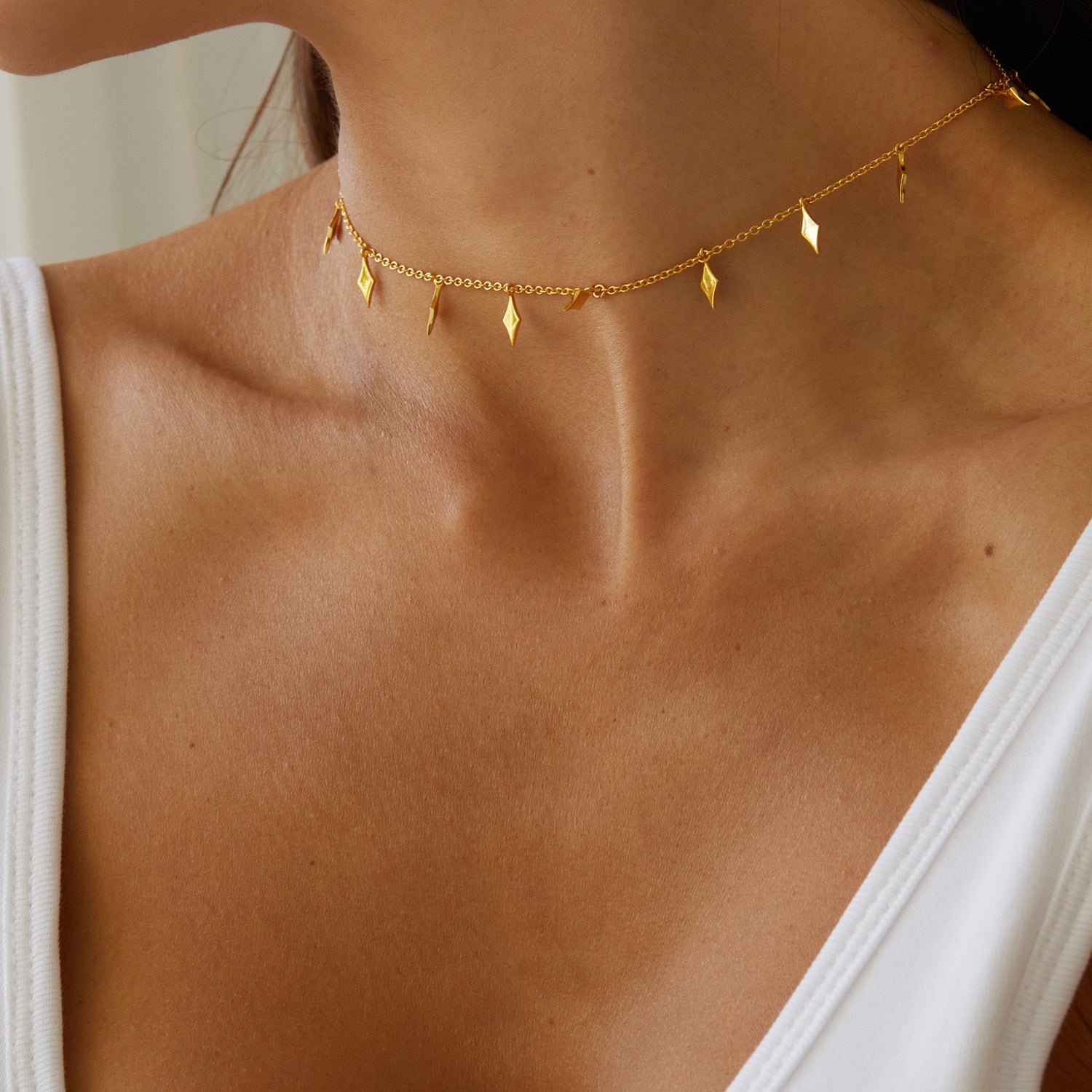 Embrace graceful sophistication with the Ravina Necklace, a contemporary piece that beautifully balances modern design and timeless charm. Crafted from high-quality Sterling Silver and plated in radiant gold, this necklace features delicate diamond-shaped pendants along an elegant O-link chain. Each charm catches the light with every movement, adding a subtle touch of brilliance and femininity — perfect for both layering or wearing solo.