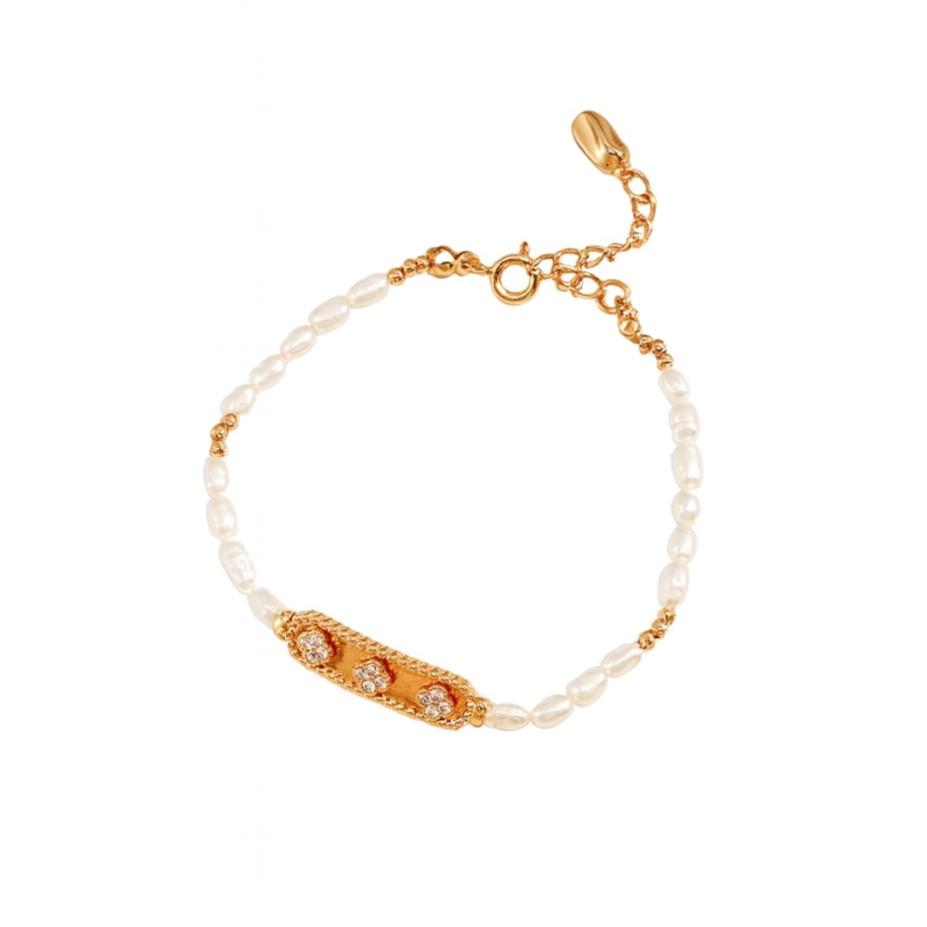 Discover the timeless grace of the Titania Bracelet, a radiant fusion of classic luxury and natural beauty. Expertly crafted with luminous freshwater pearls and a finely detailed gold-plated bar accented by sparkling zircon flowers, this bracelet captures a soft, feminine charm inspired by nature’s elegance. The subtle luster of pearls harmonizes beautifully with the brilliance of zircon, creating a refined look perfect for both everyday wear and special occasions.